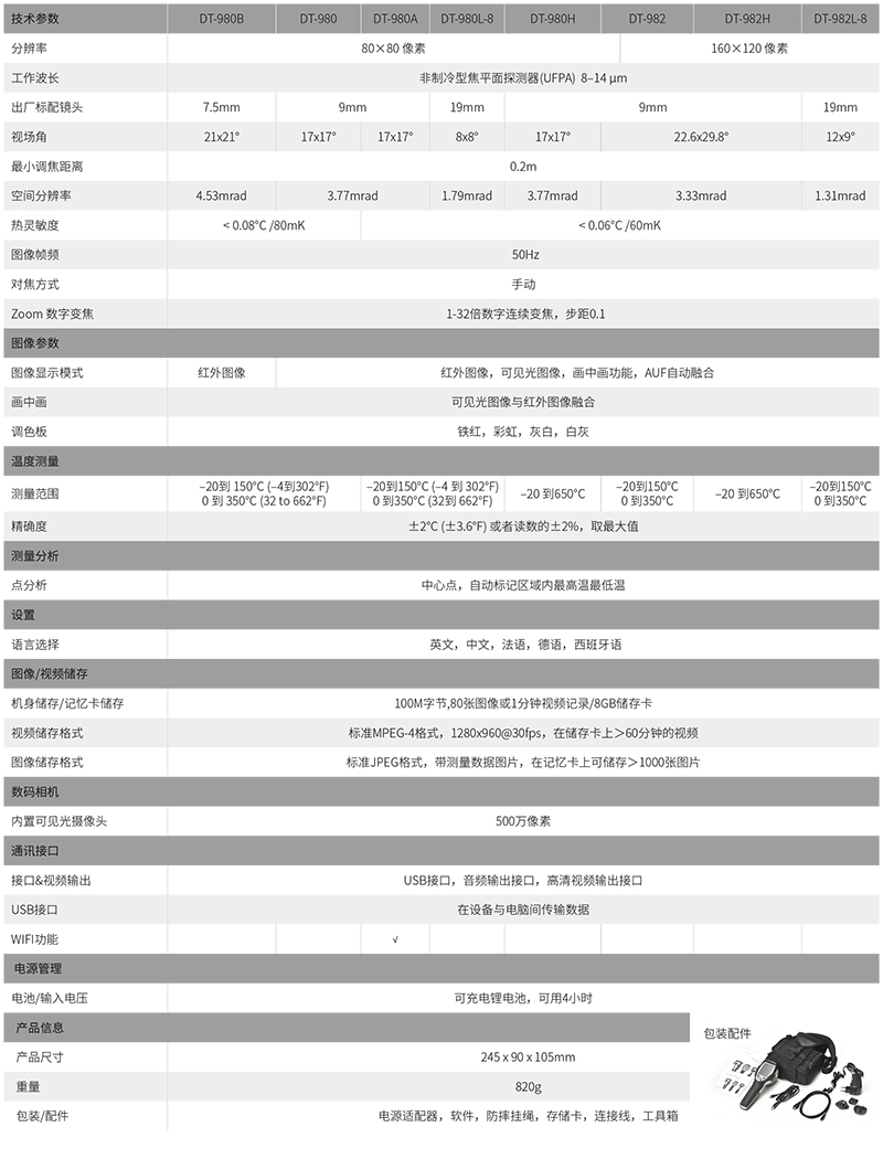 CEM DT-980系列專業(yè)工具型紅外熱像儀, 包含80*80、160*120像素分辨率,體積小巧、 結實耐用、性價比高,32倍數(shù)字變焦、50Hz圖像幀頻以及不同的型號的參數(shù)設置,能更好的滿足電力、環(huán)保、HVAC、能源以及其他日常工程建設和設備維護的需求。