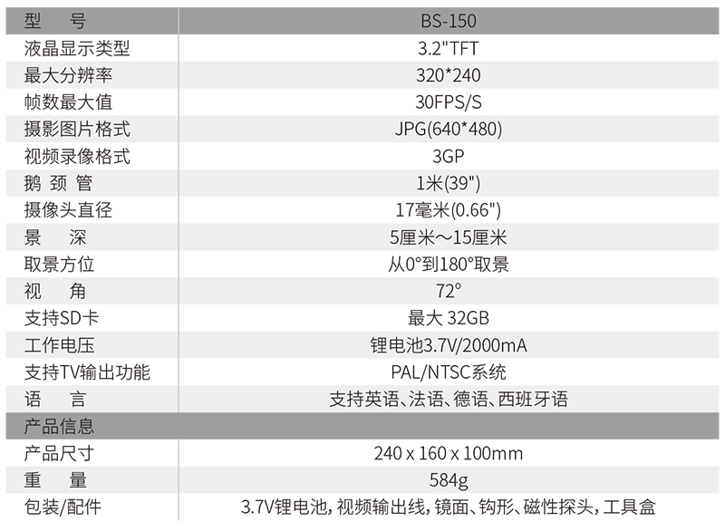 BS-150視頻儀帶有3.2”彩色液晶顯示,支持拍照和攝像,時(shí)間和日期顯示及多種語言功能。視頻和圖像可通過SD卡或USB線(包含在內(nèi))輸入電腦,BS-150的鵝頸管采用防水材料制成,靈活方便且便于機(jī)器日常的維護(hù)。