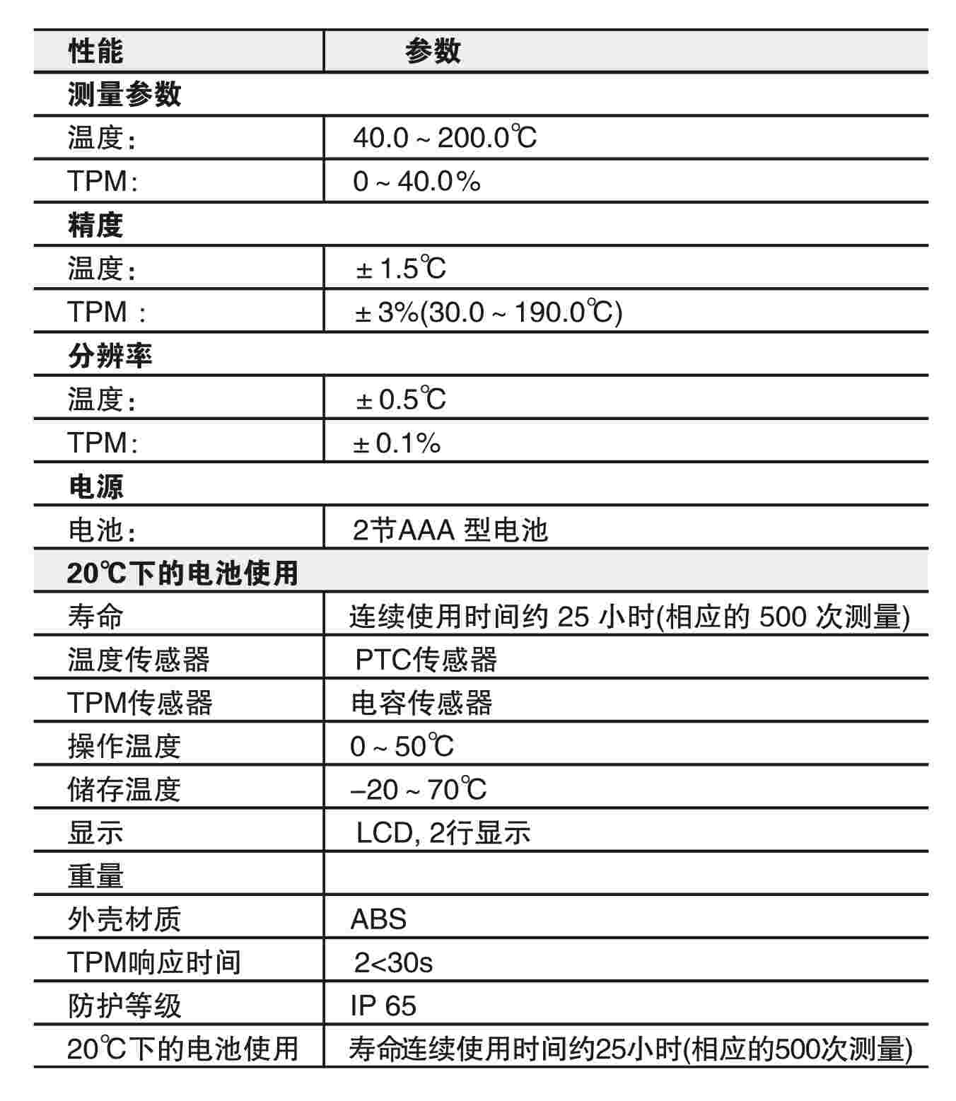 CEM DT-70是CEM華盛昌新設(shè)計、研發(fā)和生產(chǎn)的一款新型食用油品質(zhì)檢測儀,體積小巧、方便攜帶和檢測,雙注塑機殼、堅固耐用,采用進口的高精度電容式油傳感器,結(jié)合CEM近三十年的測量技術(shù)的基礎(chǔ),產(chǎn)品可同時準確顯示油溫以及TPM數(shù)值,為用戶提供快速及時的食用油品質(zhì)分析和溫度限值監(jiān)測,用于餐飲設(shè)施、食堂廚房、餐飲、還是用于食品檢驗、食品質(zhì)量保證或生產(chǎn)。