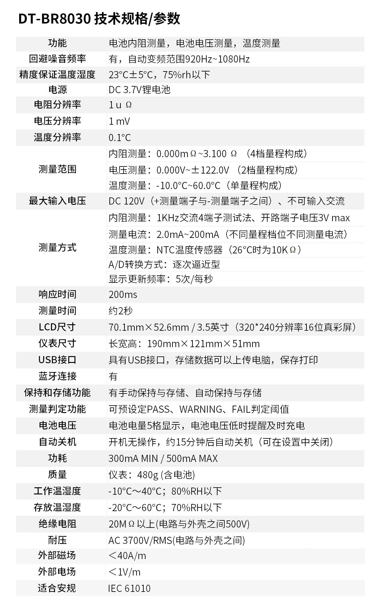 通用型充電電池內(nèi)阻測試儀 簡稱:電池內(nèi)阻測試儀,是用于測量鉛蓄電池、鋰電池等充電電池的內(nèi)阻、電壓與溫度,以判斷電池健康狀態(tài)的測量儀器,同時可以作為測量電解電容ESR參數(shù)的儀表(僅供參考)。本儀表使用交流4端子測試法測量電池內(nèi)阻,可不受測試線、端子與電池電極之間接觸電阻影響測量正確的測量值。同時還具有數(shù)據(jù)存儲、數(shù)據(jù)查閱、報(bào)警、自動關(guān)機(jī)等功能。整機(jī)高檔美觀,量程寬廣,分辨率高,操作便捷,攜帶方便,準(zhǔn)確、可靠、性能穩(wěn)定,抗干擾能力強(qiáng)。是電池生產(chǎn)、電池安裝、設(shè)備生產(chǎn)、設(shè)備維修等場景必不可少的儀器。