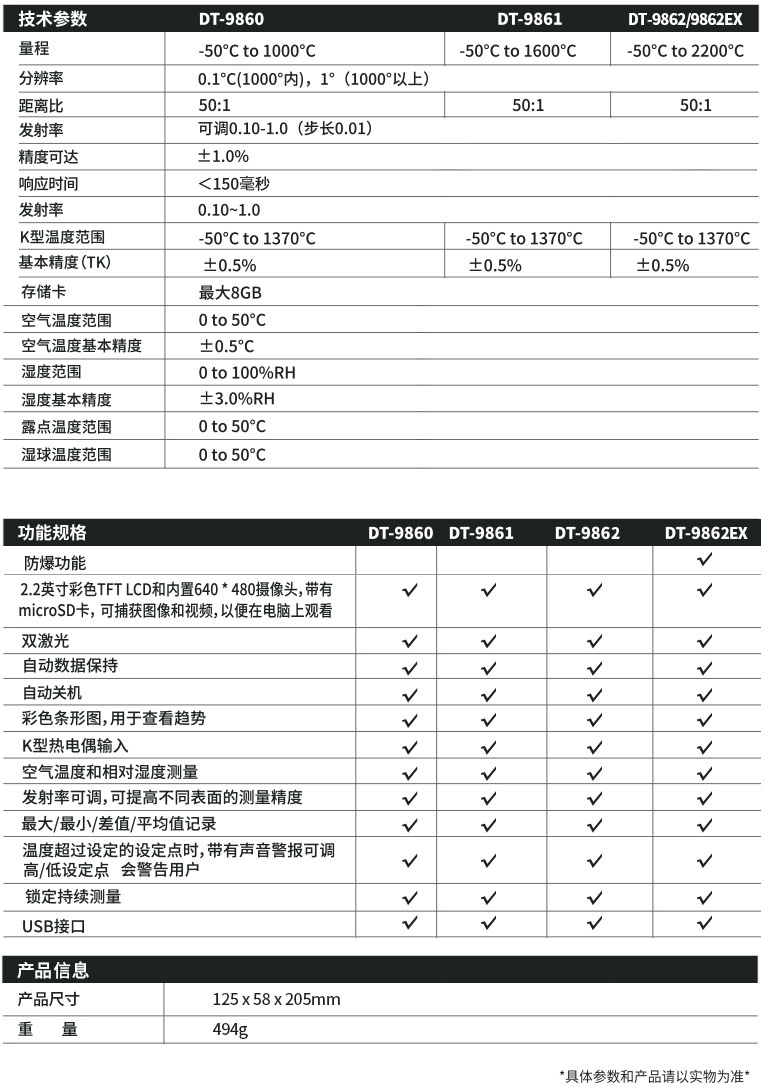 DT-9860/9861/9862/9862EX是CEM華盛昌新推出的紅外攝溫儀產(chǎn)品,該產(chǎn)品基于非接觸式紅外測溫技術(shù),可測量紅外溫度,從而從一個安全距離測定溫濕度。該產(chǎn)品具有專利權(quán)的視頻和照片拍攝功能,并配備了2.2”的彩色TFT液晶屏,可以讓您的紅外測溫的工作更直觀和高效。