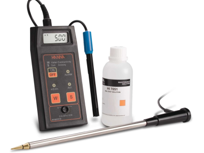 HI993310專為快速準(zhǔn)確的進(jìn)行土壤活度,灌溉和營養(yǎng)液的電導(dǎo)率測量而設(shè)計(jì)。儀器配有兩種專用電極:HI76305不銹鋼電極,錐形設(shè)計(jì)用于直接測量土壤;HI76304用于測量營養(yǎng)液和灌溉用水的電導(dǎo)率值。HI993310即可測量電導(dǎo)率(mS/cm)也可測鹽的活度。儀器前面板的兩個(gè)鍵可以選擇不同的量程,對應(yīng)指示燈將表明所選量程。此外,HI993310有報(bào)警指示燈,如果土壤太干或缺乏如鉀(K)、氮(N)等營養(yǎng)物質(zhì),報(bào)警指示燈會(huì)亮。在進(jìn)行干燥或硬質(zhì)土壤測定時(shí),須在土壤中加入去離子水進(jìn)行潤濕。直接測量土壤時(shí),使用不銹鋼錐形電極HI76305。電極插入被測土壤中,儀器將顯示電導(dǎo)率值。