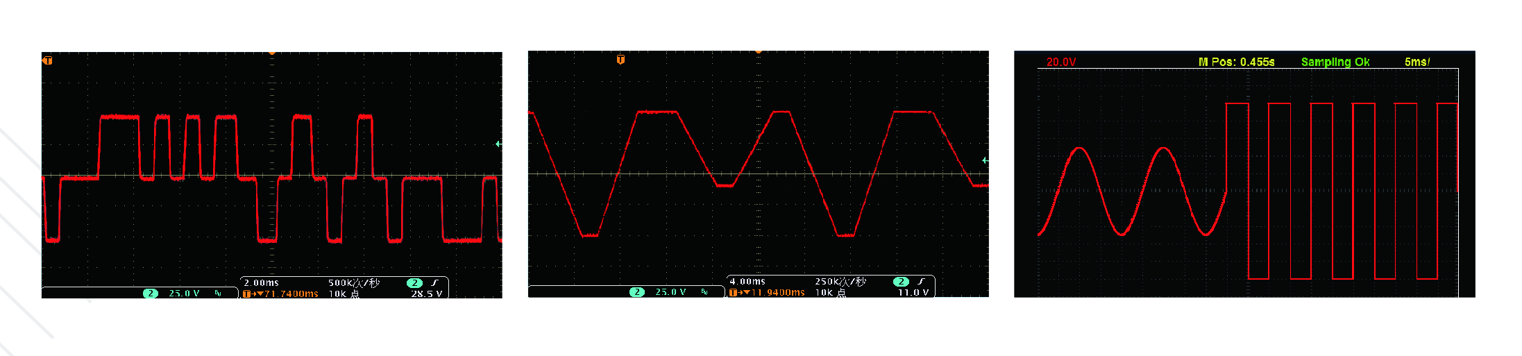IT7600系列內(nèi)建多種不同類(lèi)型的波形,如三角波、正弦波、方波、鋸齒波等波形,用戶(hù)可以通過(guò)菜單調(diào)用并在LCD屏幕上顯示出選擇的波形。