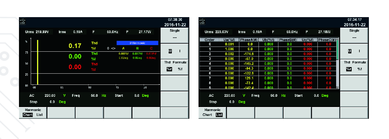 IT7600系列擁有諧波分析功能,包括電壓諧波測(cè)量和電流諧波測(cè)量。10-500Hz頻率范圍內(nèi),可以測(cè)量50次電壓和電流諧波;500Hz頻率以上,可以測(cè)量20次電壓和電流諧波。在諧波模式下可實(shí)現(xiàn)電壓和電流諧波失真因數(shù)(U/I THD)和相位的測(cè)試。此外還可進(jìn)行多次諧波測(cè)量,結(jié)果以列表或柱狀圖的方式顯示,使測(cè)試結(jié)果分析更加一目了然。