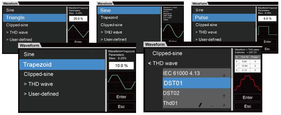 除了基礎(chǔ)正弦波,IT7900系列提供多種內(nèi)置的交流波形,例如三角波,鋸齒波,方波,梯形波和削幅波。用戶可通過菜單調(diào)用并在LCD屏幕上顯示出選擇的波形。結(jié)合設(shè)備的序列編程功能,可組合不同波形的連續(xù)輸出,以應(yīng)對復(fù)雜的電力電子擾動測試。