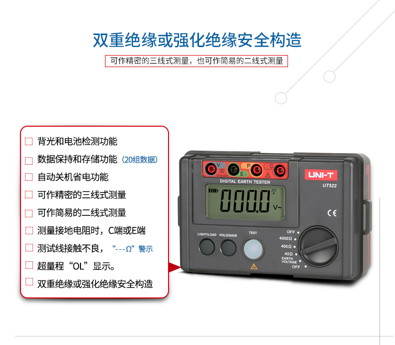 UT522接地電阻測(cè)試儀具有背光和電池低電壓顯示、數(shù)據(jù)保持和存儲(chǔ)、自動(dòng)關(guān)機(jī)省電功能。可作精密的三線式測(cè)量,也可作簡(jiǎn)易的二線式測(cè)量。可適用于測(cè)量各種電力系統(tǒng),電氣設(shè)備,防雷設(shè)備等接地系統(tǒng)的接地電阻值,還可以進(jìn)行接地電壓測(cè)量。適用于冶煉、通訊、制造、石油、電力、化工、建筑等作業(yè)接地系統(tǒng)的測(cè)試