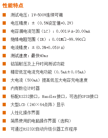 TH2689A型電容器漏電流/絕緣電阻測(cè)試儀分別提供最大測(cè)試電壓:500V,充電電流0.5mA~500mA(>100V時(shí)由最大輸出功率50W限制)。主要應(yīng)用于電解電容/陶瓷電容等漏電流,絕緣電阻及鋁電解電容陽(yáng)極箔耐壓測(cè)試。也可應(yīng)用突波吸收器,齊納二極管,氖燈管等動(dòng)作電壓確認(rèn)和漏電流測(cè)試。標(biāo)配了RS232、Handler接口,可選購(gòu)的GPIB接口,以及穩(wěn)定快速的測(cè)量,使TH2689不僅可以應(yīng)用于進(jìn)貨檢驗(yàn),更可應(yīng)用于自動(dòng)化生產(chǎn)測(cè)試等等。