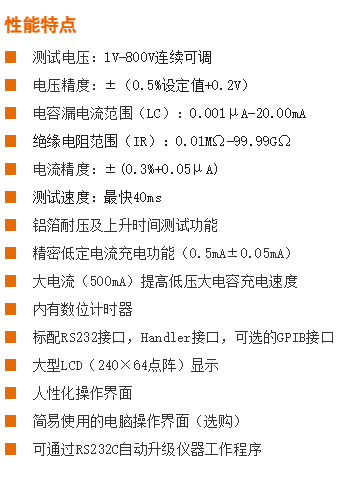 充電電流 | 測試電壓≤100V時,0.5mA-500mA ; 測試電壓>100V時,0.5mA-IMAX,IMAX=50W/測試電壓±(3%設定值+0.05mA) |