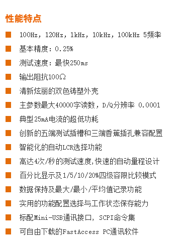 為應(yīng)對(duì)不同場(chǎng)所的需求,在TH2822D/E上增加了多個(gè)信號(hào)電平測(cè)試,增加了DCR測(cè)試功能,測(cè)試準(zhǔn)確度達(dá)0.1%。 TH2822系列提供USB接口通訊能力,可方便的與PC進(jìn)行數(shù)據(jù)通訊和遠(yuǎn)程控制。為滿足用戶不斷增加對(duì)SMD器件的測(cè)試需求,用戶還可以選擇TH26009C和TH26029C兩種SMD四段開爾文測(cè)試鉗,以平衡性能和價(jià)格的不同需求。