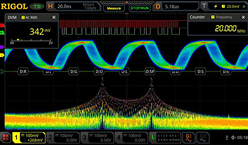 高達(dá)500,000wfms/s 的波形捕獲率,可以快速地發(fā)現(xiàn)信號(hào)中存在的毛刺和其他偶發(fā)事件,從而極大地提高了工程師的調(diào)試效率。