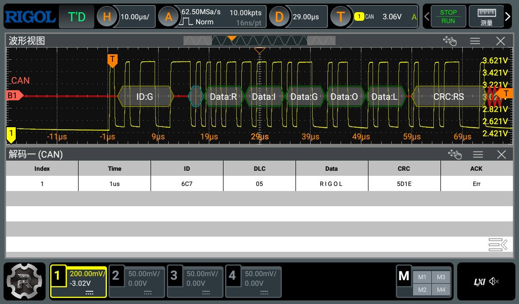 DHO900具有豐富的觸發(fā)功能,包括常用的邊沿,斜率,脈寬等,以及部分串行協(xié)議觸發(fā),如:嵌入式調(diào)試常用的I2C、SPI、RS232協(xié)議以及汽車行業(yè)常用的CAN、LIN協(xié)議的觸發(fā)與解碼。DHO900的總線觸發(fā)和解碼功能能夠準(zhǔn)確捕獲并解析協(xié)議信息,在波形上直接顯示解碼內(nèi)容或以事件表的形式展現(xiàn),讓您的調(diào)試更便捷直觀。