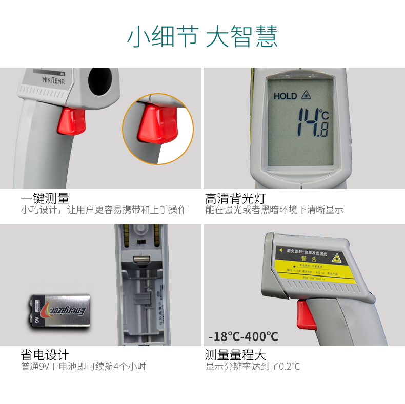 MiniTemp - 用于汽車故障診斷的紅外測(cè)溫儀,檢測(cè)車輛軸承、軸箱表面溫度,防止熱軸、燃軸和切軸事故,確保行車安全,及時(shí)查找配電盤中的熱點(diǎn)和松動(dòng)的電子接點(diǎn),快速診斷電器故障。