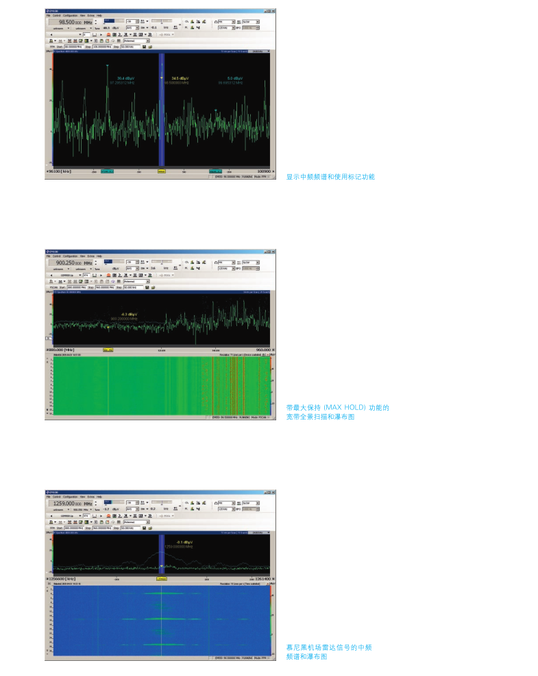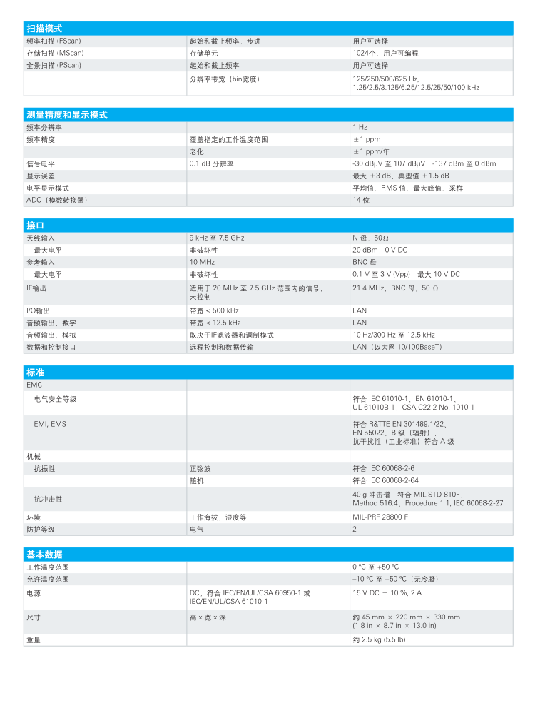 ? 可在 9 kHz 至 7.5 GHz 的整個頻率范圍,進行快速全范圍掃描,掃描速率高達 1.8 GHz/s? 150 Hz 到 500 kHz 帶寬解調(diào)和 10MHz 中頻頻譜