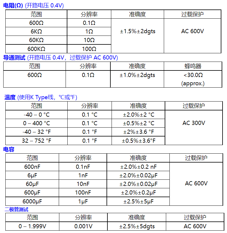 電阻、電容量測(cè)時(shí): 600V 過載保護(hù)