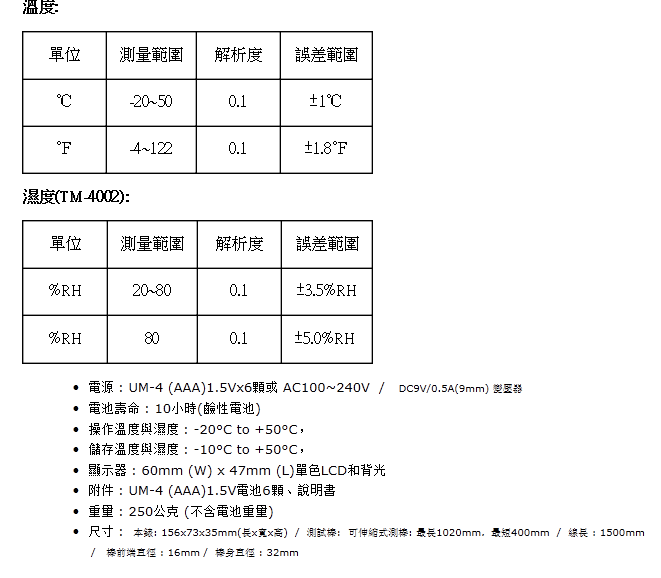 風(fēng)速:0.01-40m/s,風(fēng)量:0-9999CFM,溫度:-20-50°C,資料記錄99筆