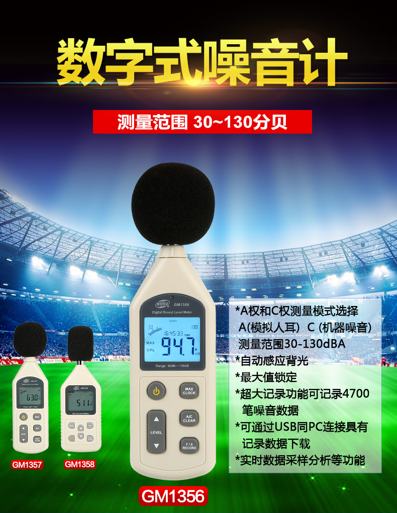 *測(cè)量范圍:30~130 dBA;35~130 dBC*精確度:±1.5 dB