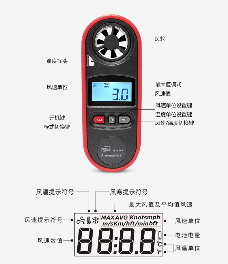 風(fēng)速: 0~30米/秒, 1.4~90千米/小時(shí), 0~5860英尺/分, 0~55海里/小時(shí), 0~65英里/小時(shí) (精確度:± 5%)