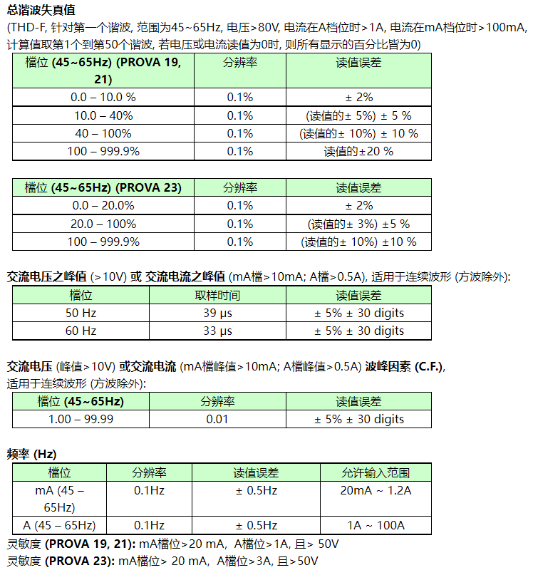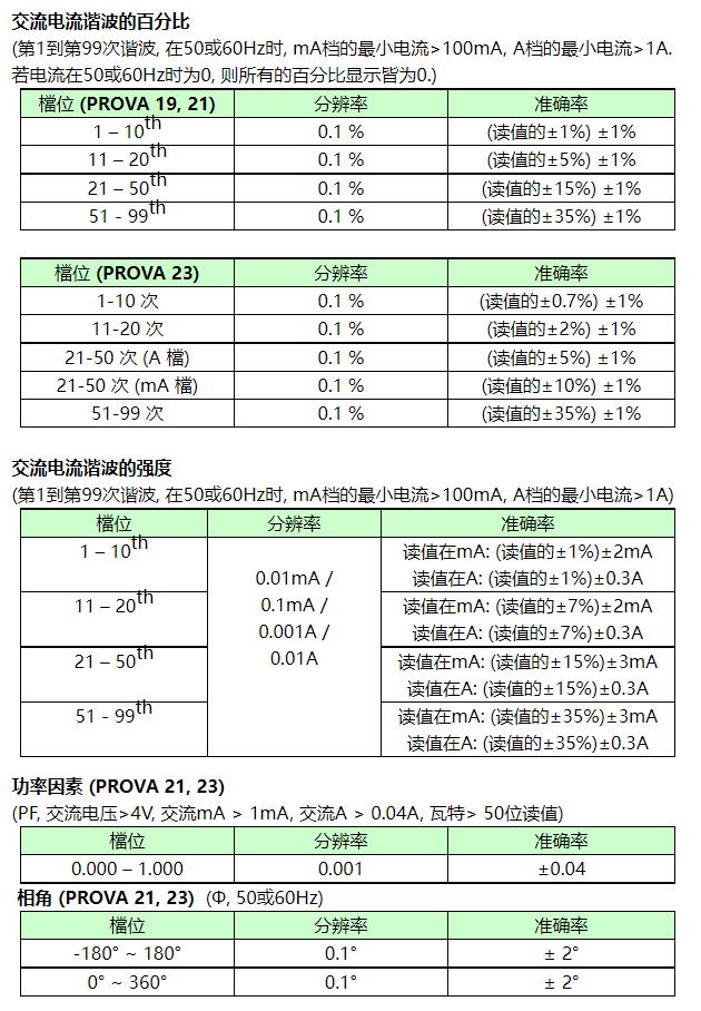 PROVA 19/21: AC交流電流 (均方根值) 最高可測50A: 0.5%基準(zhǔn)誤差