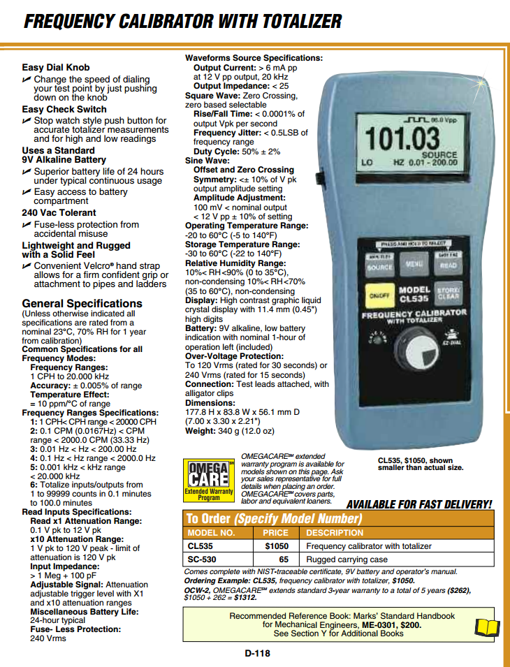 The Omega CL535 is an excellent tool for calibration, test, and diagnostics of instruments that use frequency signals. Instruments include tachometers, frequency counters, integrators, and any other frequency devices in the shop, plant and/or field. The CL535 brings all the features you would expect from a frequency calibrator and timesaving new ones with the easy dial knob and easy check switch saving hours of troubleshooting time. The CL535 comes with an LED indicator showing gate time for easy trigger level adjustment. When calibrating a totalizer, the CL535 eliminates the need of a stop watch. The calibrator will automatically stop when the selected number of pulses has been sent to the totalizer.