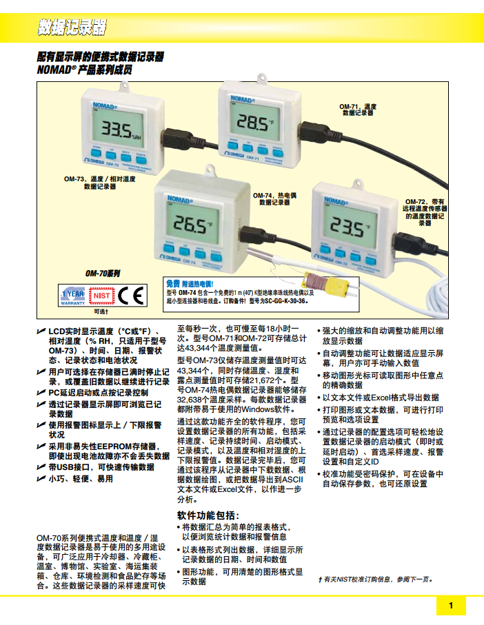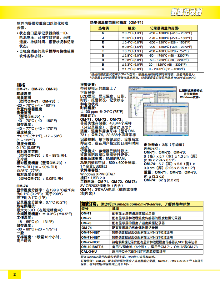 型號OM-73僅儲存溫度測量值時可達43,344個,同時存儲溫度、濕度和露點測量值時可存儲21,672個。型號OM-74熱電偶數(shù)據(jù)記錄器能夠儲存32,638個溫度采樣。每款數(shù)據(jù)記錄器都附帶易于使用的Windows軟件。