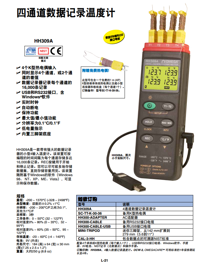 同時(shí)顯示4個(gè)通道,或2個(gè)通道的差值 數(shù)據(jù)記錄器記錄每個(gè)通道的16,000條記錄 USB和RS232接口,含Windows?軟件