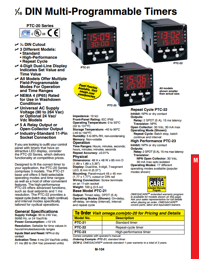 Designed for you to best fit the correct timer to your application, the PTC-20 series is divided into three separate models. The PTC-21 base unit offers five field-selectable operating modes and time ranges as well as a host of other convenient features. The high performance PTC-23 model offers advanced functions such as dual setpoints and 1 ms resolution. The PTC-22 repeat cycle model provides a repeat cycle (batch stop, batch continue) and interval modes specifically tailored for cyclical operations.