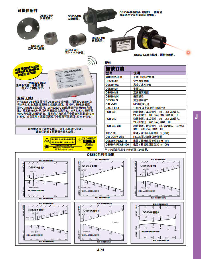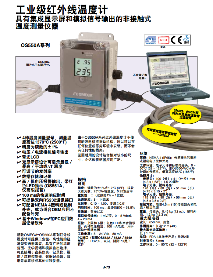 工作環(huán)境: 電子元件和標(biāo)準(zhǔn)傳感頭,0 ~ 50°C (32 ~ 122°F);帶OS550-WC水冷護(hù)套的傳感頭,高溫度85°C (185°F)