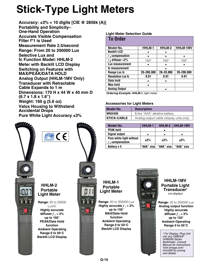 棒型照度計HHLM-2, HHLM-1, HHLM-1MV