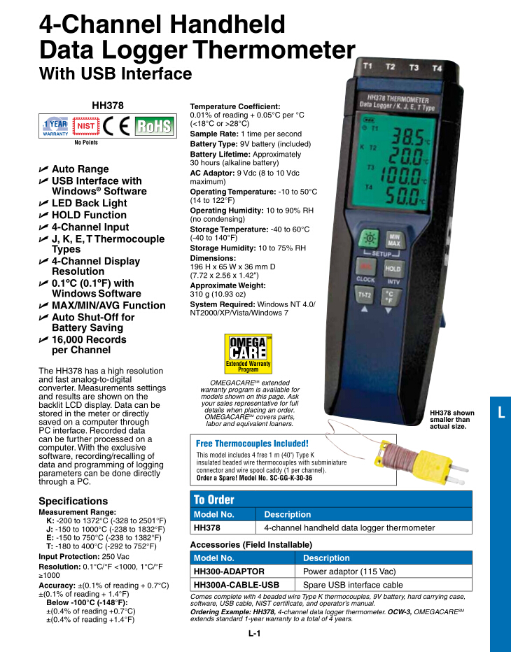 美國omega 4通道手持?jǐn)?shù)據(jù)記錄器溫度計(jì)HH378 Series