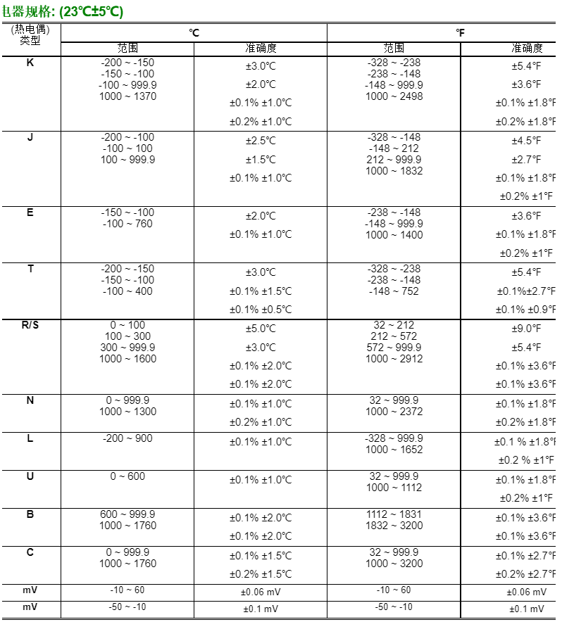 準(zhǔn)確度0.1% ± 1 ℃ (K型熱電偶)