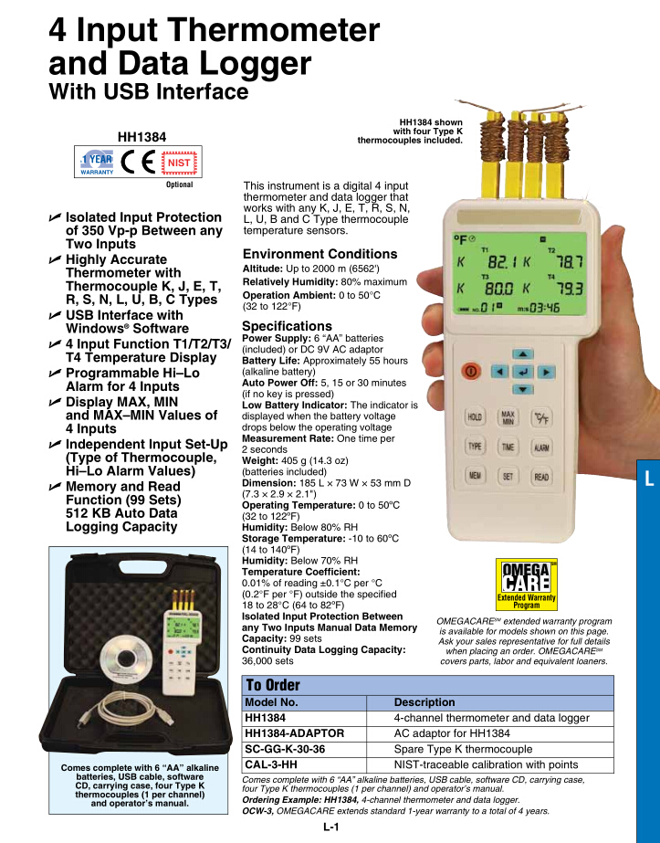 美國omega 4輸入溫度計和數(shù)據(jù)記錄器HH1384