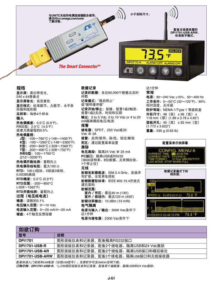 OMEGA的全新1/8 DIN DPi1701系列圖形顯示面板儀表和數(shù)據(jù)記錄器提供無與倫比的顯示功能和性能。帶背光的高亮圖形顯示屏(240 x 64 像素點)擁有強大的顯示功能, 可顯示水平條形圖、線形圖并且 進行實時數(shù)據(jù)記錄。這種裝置可配置為接受熱電偶(J、K、T、E、R和S型)、RTD(2線或3線)、電壓(0~10 Vdc)或電流(0~20 mA)。可選功能包括兩個C型繼電器、 隔離的USB或RS232 PC接口、 隔離模擬輸出、隔離24 Vdc激勵和無線接收器。