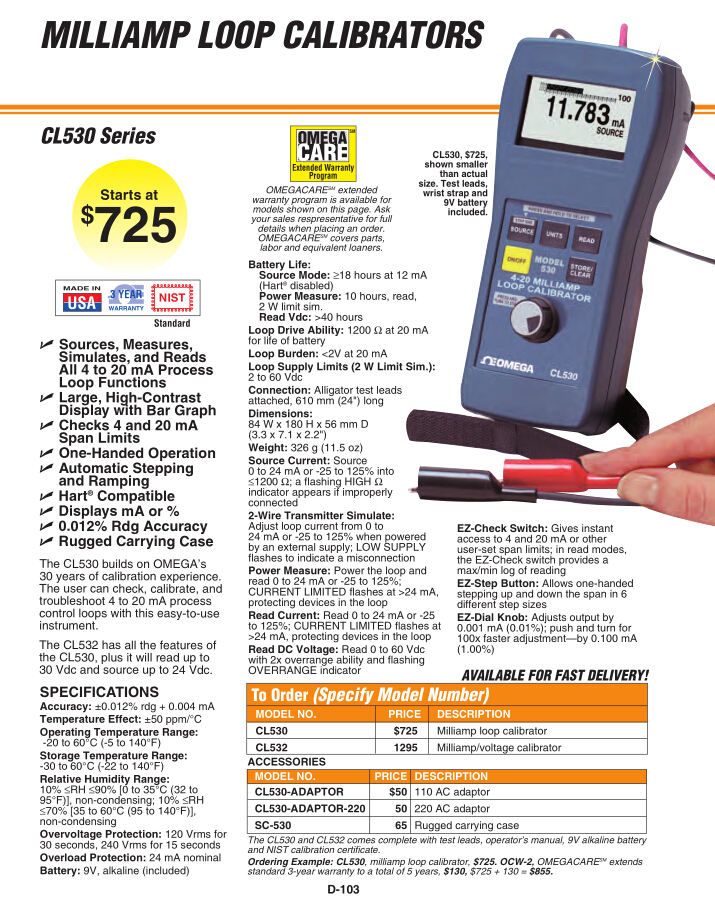 美國omega 毫安回路校準(zhǔn)器CL530