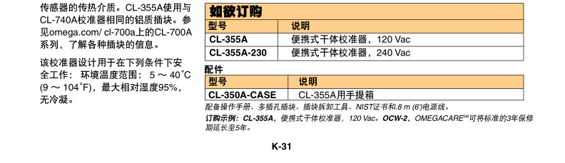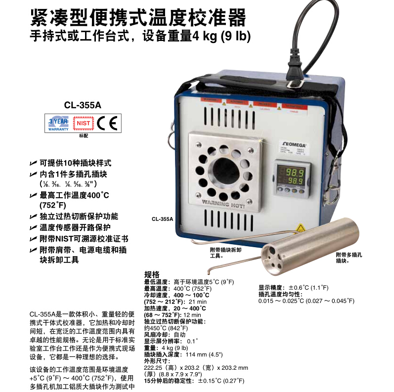CL-355A是一款體積小、重量輕的便攜式干體式校準(zhǔn)器,它加熱和冷卻時(shí)間短,在寬泛的工作溫度范圍內(nèi)具有卓越的性能規(guī)格。無論是用于標(biāo)準(zhǔn)實(shí)驗(yàn)室工作臺工作還是作為便攜式現(xiàn)場設(shè)備,它都是一種理想的選擇。該設(shè)備的工作溫度范圍是環(huán)境溫度+5°C (9°F) ~ 400°C (752°F),使用多插孔機(jī)加工鋁質(zhì)大插塊作為測試中傳感器的傳熱介質(zhì)。CL-355A使用與CL-740A校準(zhǔn)器相同的鋁質(zhì)插塊。參見omega.com/ cl-700a上的CL-700A系列,了解各種插塊的信息。該校準(zhǔn)器設(shè)計(jì)用于在下列條件下安全工作: 環(huán)境溫度范圍: 5 ~ 40°C (9 ~ 104°F),大相對濕度95%,無冷凝。