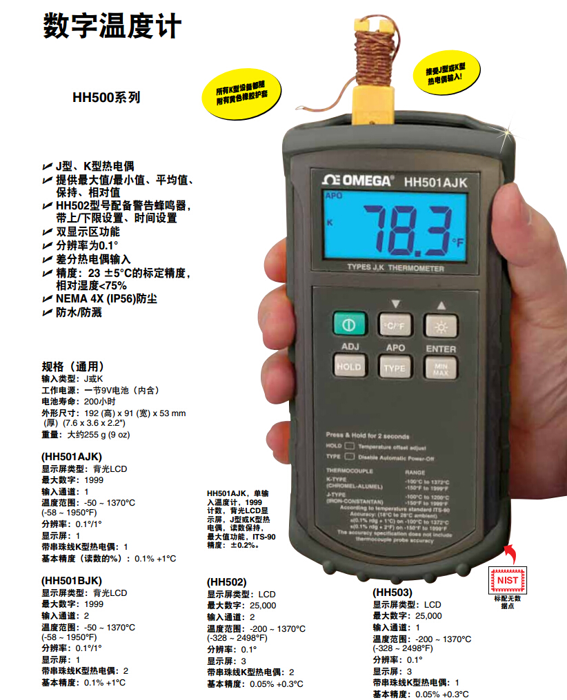 美國(guó)omega 手持式熱電偶溫度計(jì)HH500系列
