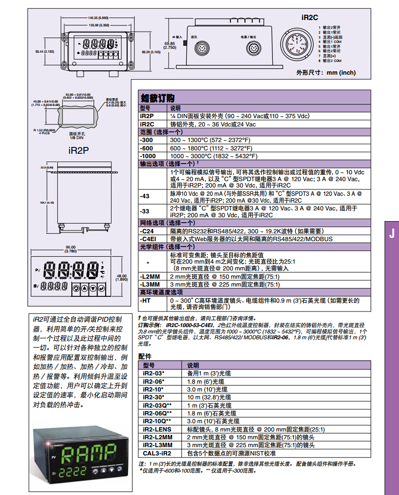 iR2可提供2種實(shí)用的套裝。iR2C型號(hào)封裝在極其堅(jiān)固的鑄鋁外殼中(NEMA 4級(jí)),可在任何表面安裝,使用20 ~ 36 Vdc或24 Vac電源。iR2P型號(hào)是一種? DIN面板安裝封裝,帶有適合在其他儀器上進(jìn)行支架或機(jī)箱安裝的NEMA 4級(jí)前蓋,使用90 ~ 240 Vac或110 ~ 375 Vdc電源。