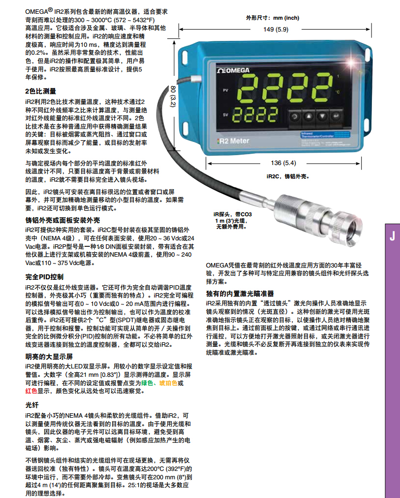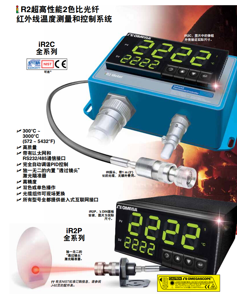 OMEGA? IR2系列包含新的耐高溫儀器,適合要求苛刻而難以處理的300 ~ 3000°C (572 ~ 5432°F) 高溫應(yīng)用。它極適合涉及金屬、玻璃、半導(dǎo)體和其他 材料的測(cè)量和控制應(yīng)用。iR2的響應(yīng)速度和精度極高,響應(yīng)時(shí)間為10 ms,精度達(dá)到滿量程的0.2%。雖然采用非常復(fù)雜的技術(shù),性能出色,但是iR2的操作和配置極其簡(jiǎn)單,用戶易于使用。iR2按照高質(zhì)量標(biāo)準(zhǔn)設(shè)計(jì),提供5年保修。