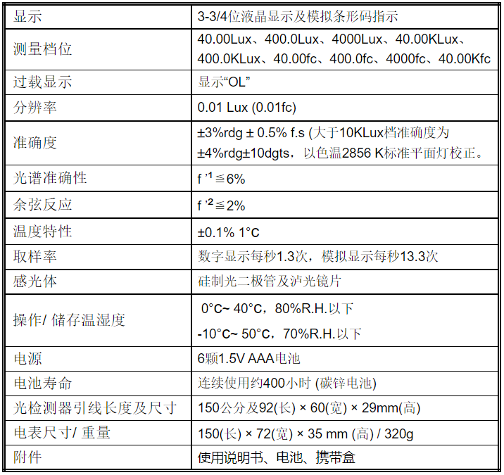 量測(cè)范圍0到400,000 Lux, 0到40,000 fc