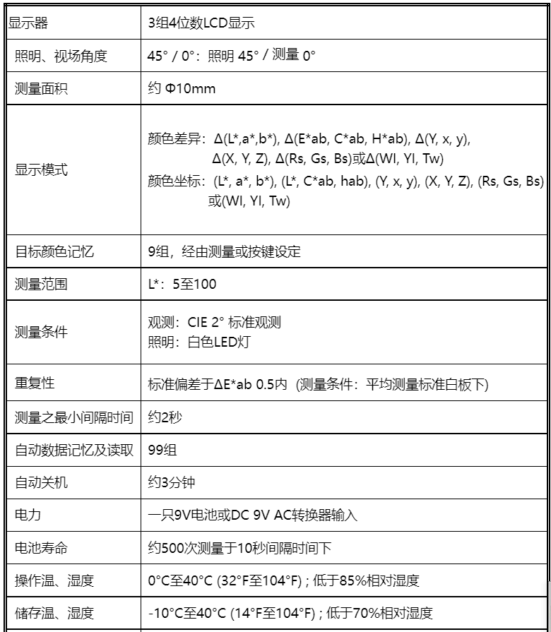色彩空間顯示(L*, a*, b*), (L*, C*ab, hab), (Y, x, y), (X, Y, Z), (Rs, Gs, Bs)或(WI, YI, Tw)