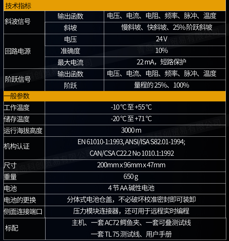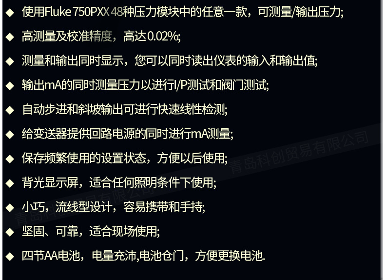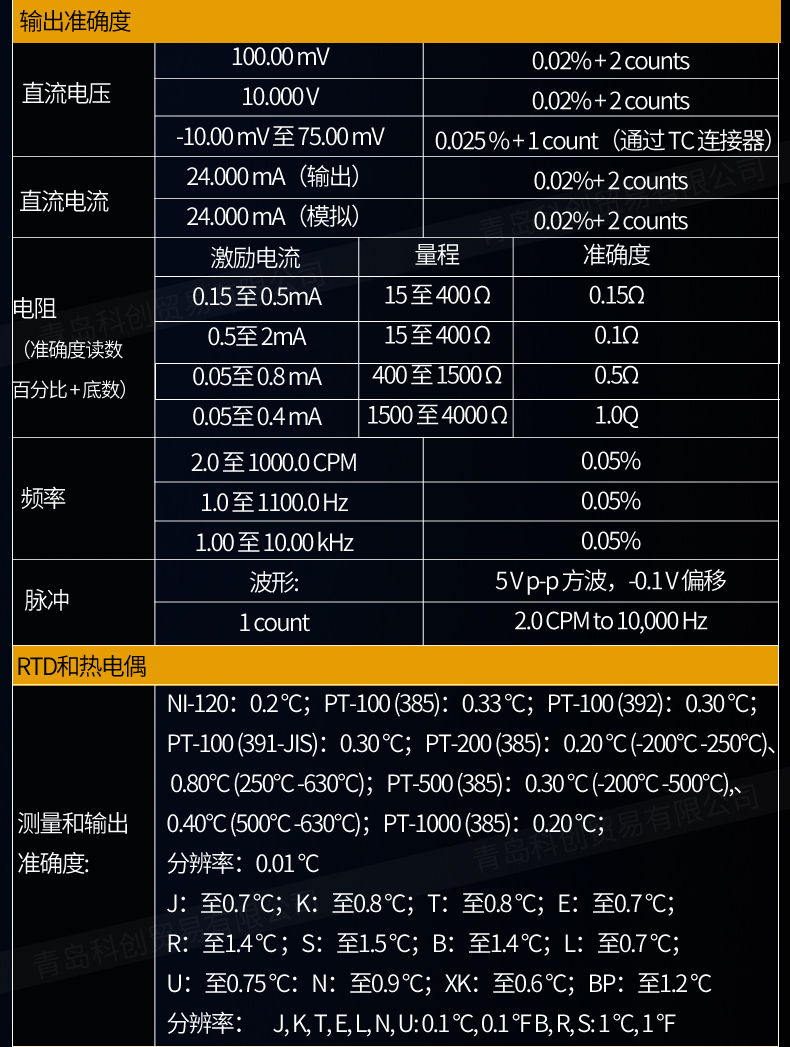 測量和輸出同時顯示,您可以同時讀出儀表的輸入和輸出值,測量伏特、毫安、鉑電阻(RTD)、熱電偶、頻率和歐姆的功能,可測試傳感器/變送器,輸出/模擬電壓、電流、熱電偶、鉑電阻(RTD)、頻率、電阻和壓力