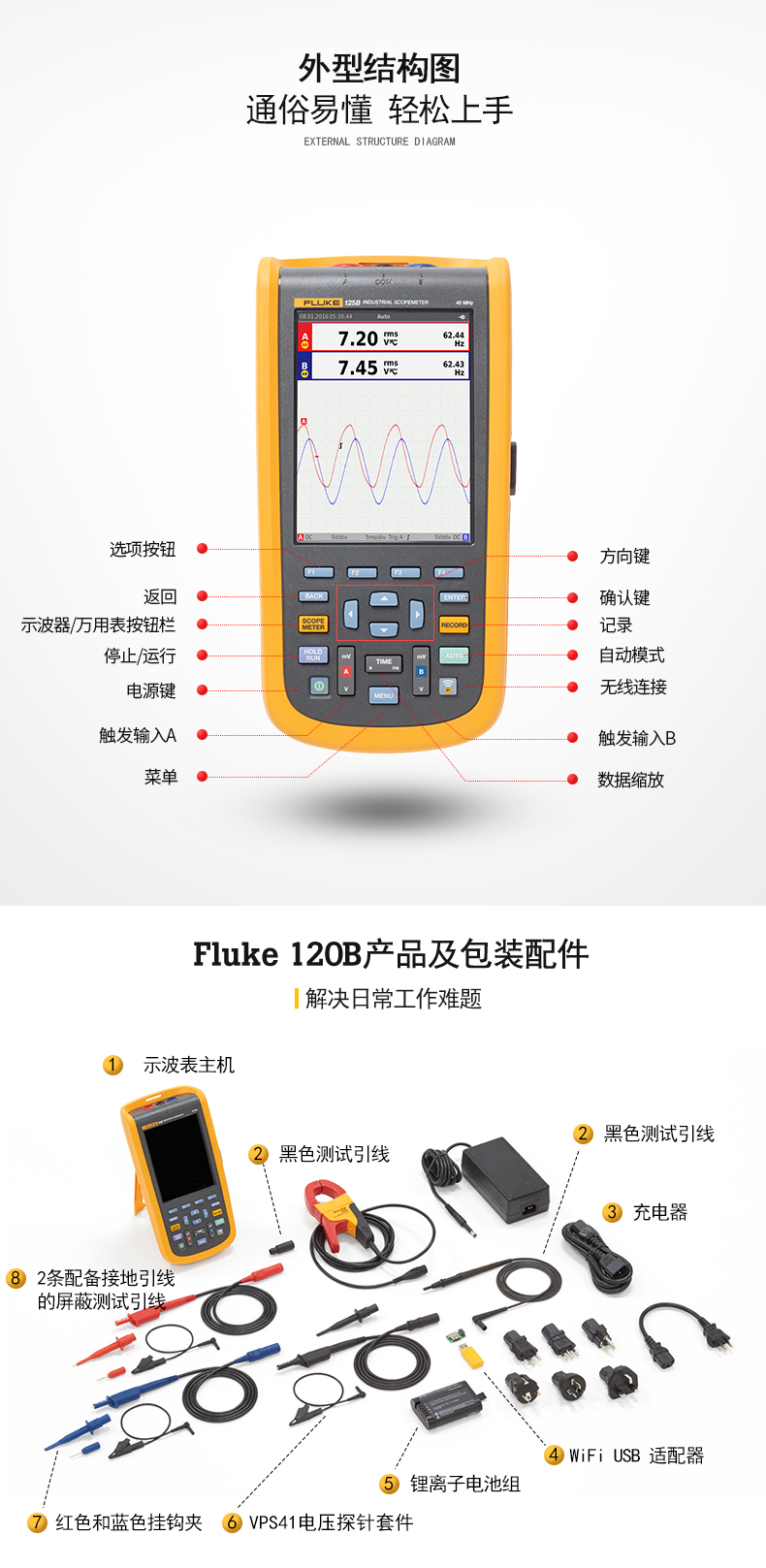 ?雙輸入數(shù)字示波器和萬(wàn)用表?40 MHz ?示波器帶屏蔽測(cè)試引線,可進(jìn)行電阻和通斷性測(cè)量?電阻、通斷性、二極管和電容計(jì)測(cè)量?功率測(cè)量(W、VA、VAR、PF、DPF、Hz)?電壓、電流和電力諧波